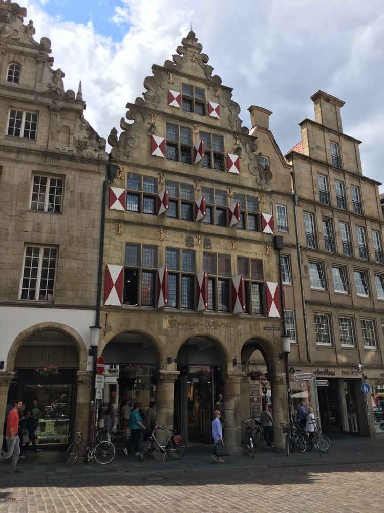 Nächste Halt Münster met wederom een groot Schloss en een fietspad rondom het centrum over wat vroeger de stadsmuren waren. Münster is overigens een echte fietsstad waar je dus met de fiets in de hele stad goed uit de voeten kunt. Op de stadsmuren hebben we lekker geluncht bij Brasserie Münster. Na de lunch hebben we nog even de fraaie binnenstad bekeken. De stad is grotendeels kapot gebombardeerd tijdens de 2e wereldoorlog maar gelukkig zijn een flink aantal markante gebouwen weer in hun oude glorie hersteld, waaronder verschillende kerken en het gemeentehuis waar de vrede van Münster getekend is, het eind van de tachtigjarige oorlog.
