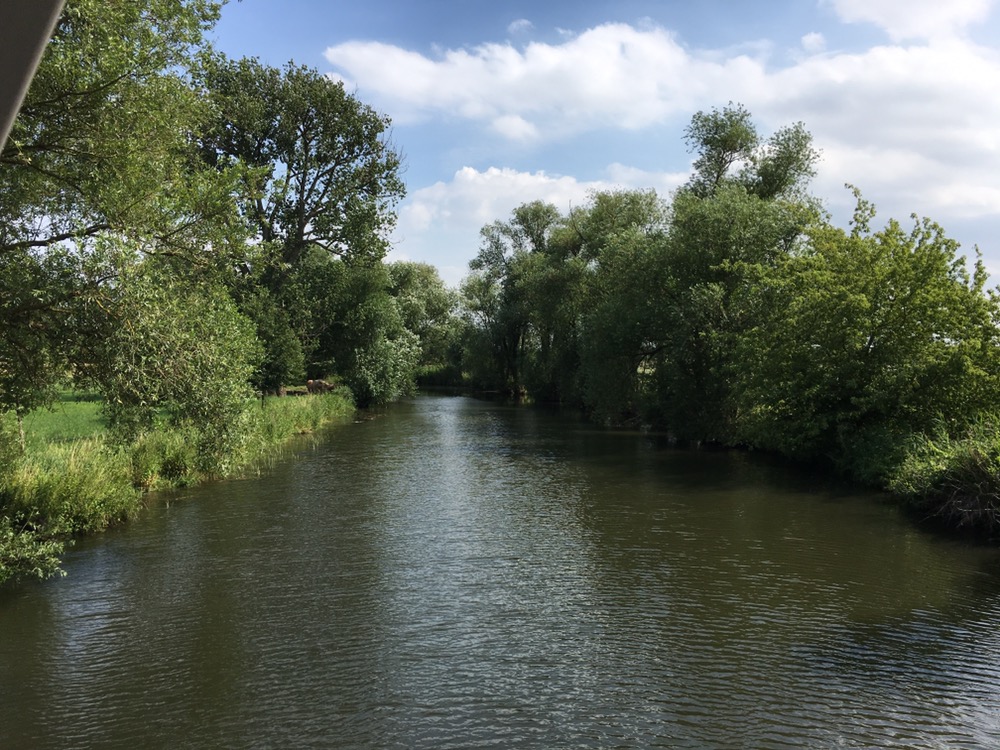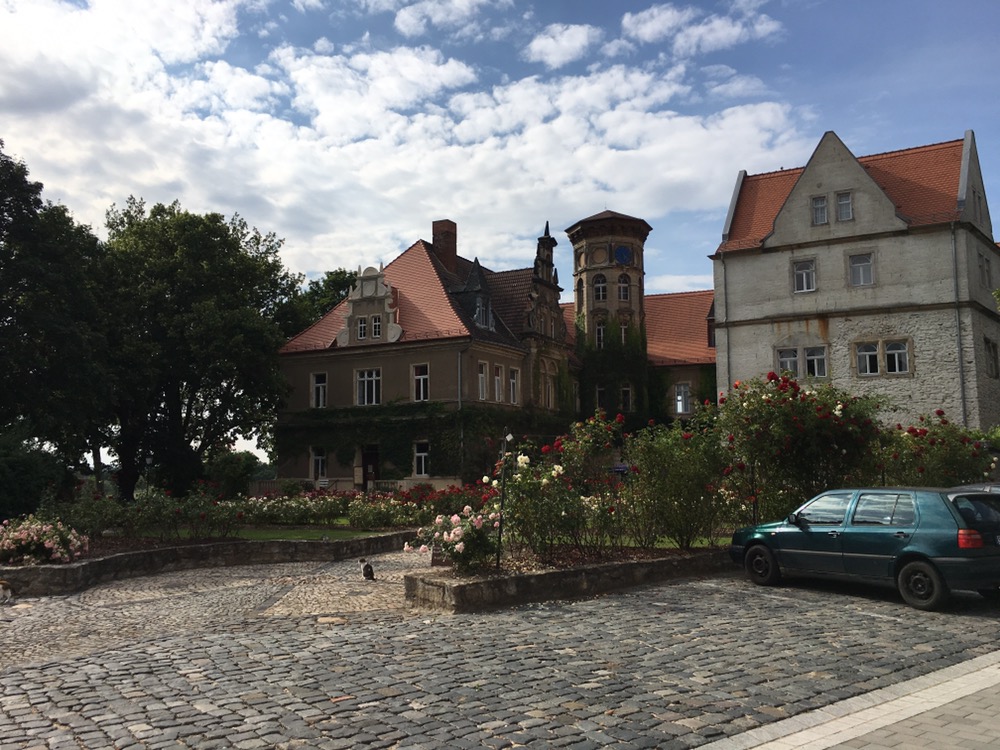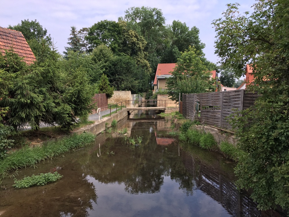 Aan het meer bevindt zich ook een Radweg Infostelle waar informatie gegeven wordt over de R1, waar je eventueel aan je fiets kan sleutelen, wat kan drinken en van het toilet gebruik kan maken. Nuttig en bijzonder. De man die dit runde kwam naar buiten om ons uit te leggen dat we een stukje verderop een andere route zouden moeten nemen omdat de eigenlijke R1 route op een bepaald stuk zo goed als onbegaanbaar zou zijn. We hebben zijn vriendelijke advies maar opgevolgd. Dit betekende wel een flink stuk langs een iets drukkere en saaie weg rijden. Gelukkig konden we vanuit Hecklingen via een doorsteekje over een veldweggetje weer op de route lomen. We fietsten langs het mooie riviertje de Bode naar Stassfurt. Daar nog even een ijs genomen en wat rondgekeken. Het oude centrum van Stassfurt is helaas niet meer. Vanwege kali-winning die grotendeels onder dat centrum plaatsvond zijn er allerlei aardverschuivingen geweest waardoor een flink deel van het oude centrum verzakte. Daar heeft men nu een soort van stadsmeertje aangelegd.