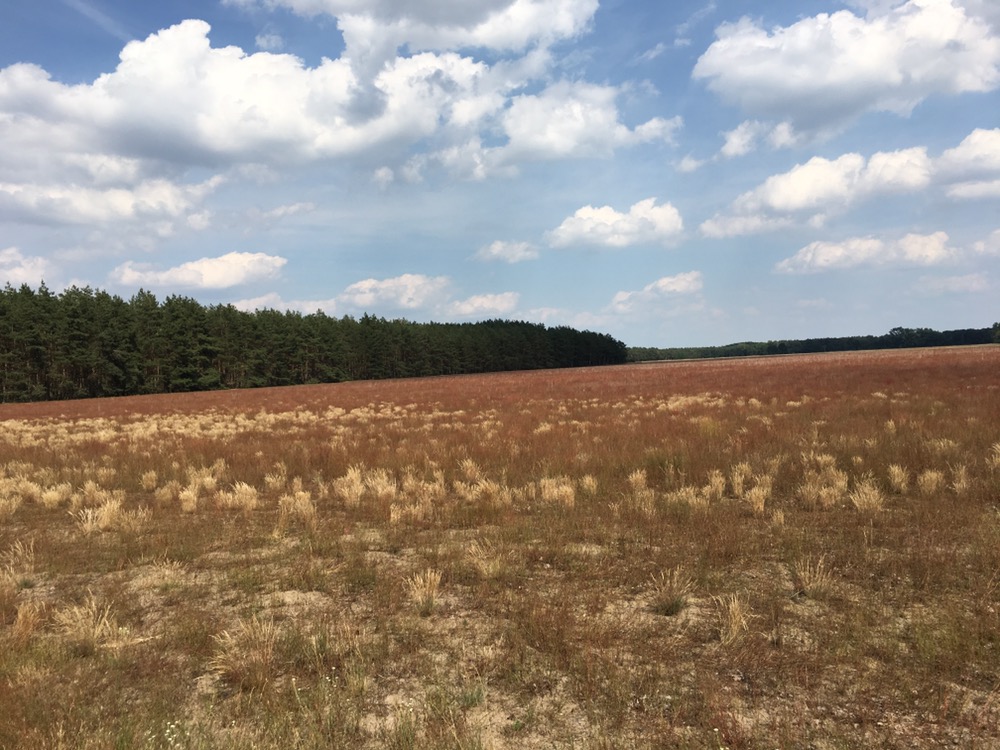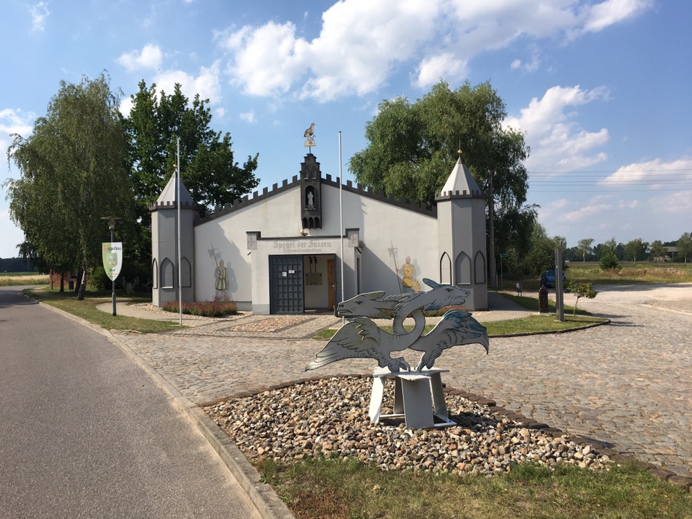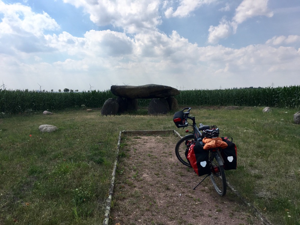 Bernburg bleek vervolgens een fraaie stad. De rivier de Saale loopt er dwars doorheen en bepaalt voor een deel het karakter van de stad. Het andere deel wordt bepaald door het oude centrum annex de burcht dat een stuk boven de stad uitsteekt. Heel fraai. Natuurlijk zijn we naar boven gereden want hoe zouden we anders vandaag nog aan 225 hoogtemeters gekomen moeten zijn? We hebben in Bernburg nog belegde broodjes ingeslagen en een kopje koffie gedronken bij een conditorei. Het stuk route dat na Bernburg volgde was afwisselend wel aardig en een beetje aan de saaie kant. We hebben voor een stukje nog een 6 kilometer langer alternatief gekozen dat iets mooier leek dan de hoofdroute. Dat stuk bevatte in ieder geval aardige stukken door een mooi natuurgebied en langs een hunebed. Van de meertjes op dit stuk route zagen we helaas zo goed als niets. Een stukje voor Dessau reden we weer door een aardig natuurgebiedje met de naam puntje-puntje-heide maar het was geen heide maar afwisseling van bos en weiland.