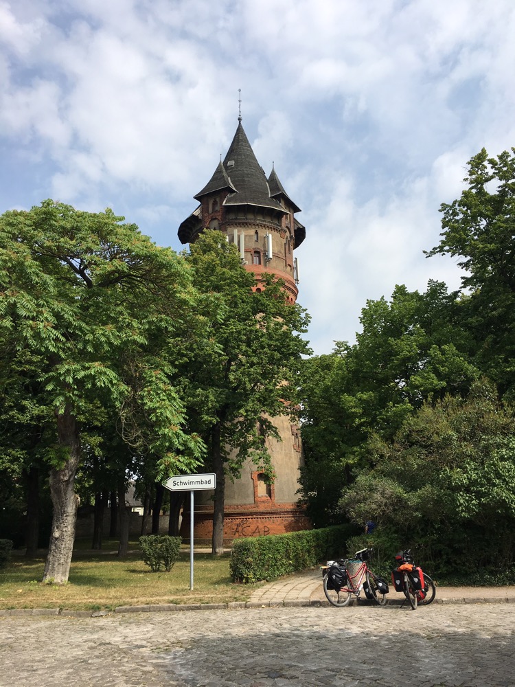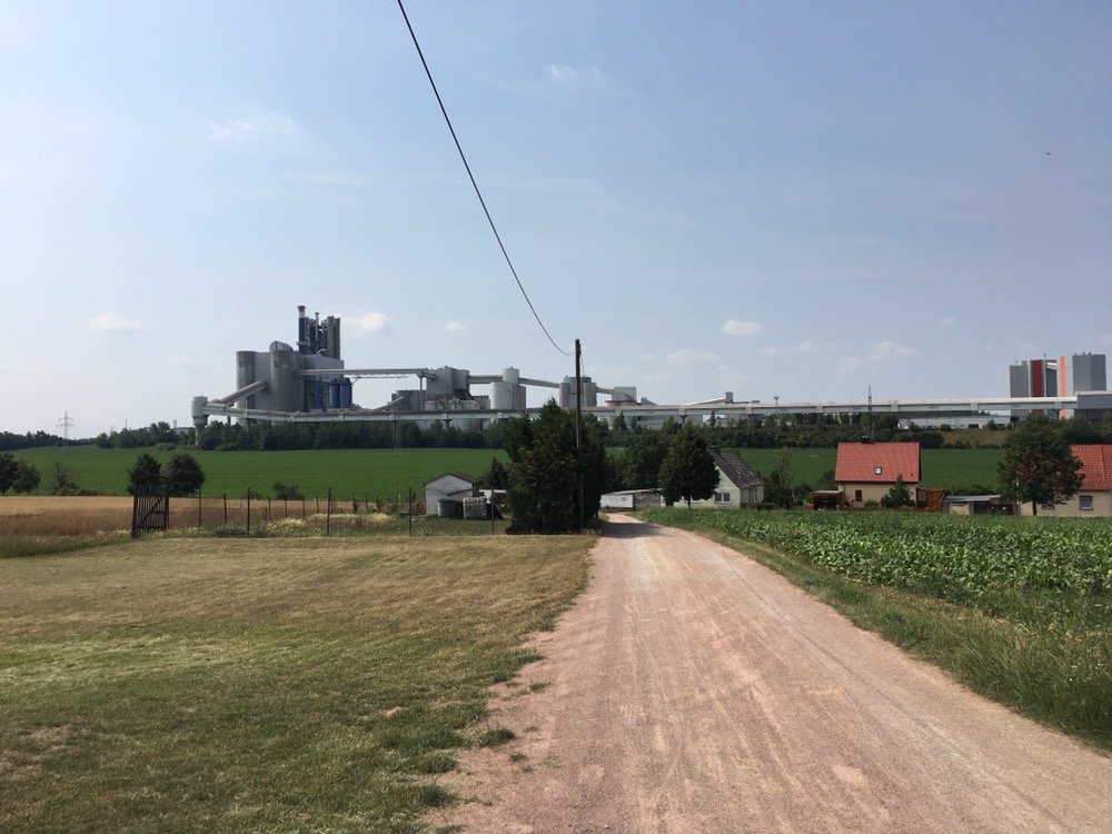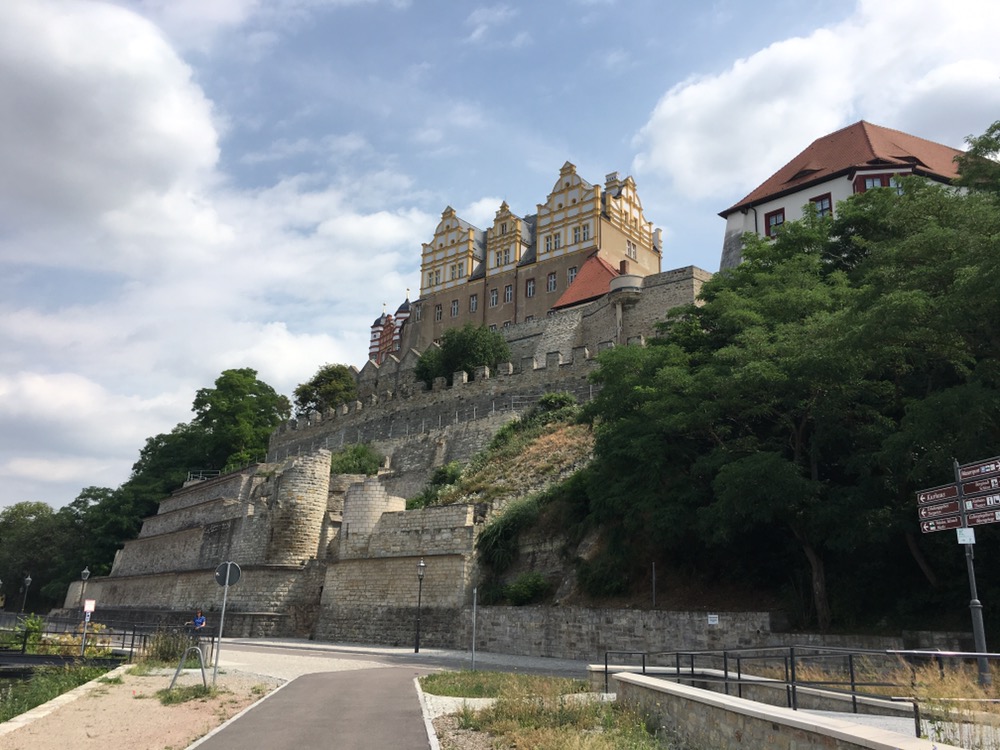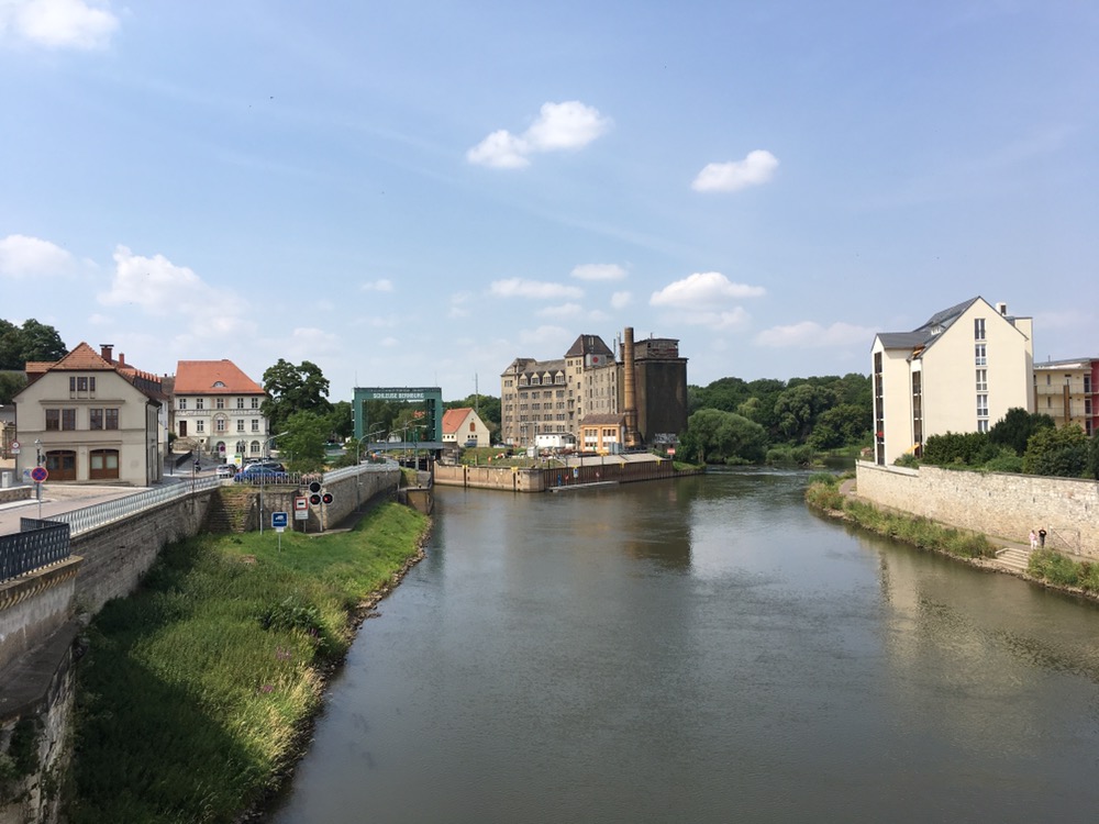 We volgden vanochtend eerst nog een stukje het riviertje de Bode tot Nienburg. Daar kwamen we langs een fraaie watertoren. Dat het een watertoren was werd ons verteld door een oudere Duitser. Die er met een knipoog aan toevoegde dat de watertoren nu nog door Telekom en co gebruikt werd. Van Nienburg naar Bernburg hebben we het nieuwe stuk R1 gevolgd. Stond niet in ons boekje (maar wel in een elektronische update) en ook de GPS track volgde nog de oude route, maar de nieuwe leek ons leuker want zou ons direct in het centrum van Bernburg brengen. De oude liet het centrum links (eigenlijk rechts) liggen. Dit was een aardig stuk route die ons onder andere langs een gigantisch industrieel complex bracht. Geen idee waar het voor diende. Het maakte in ieder geval geen lawaai, er was geen stank en geen zichtbare uitstoot.