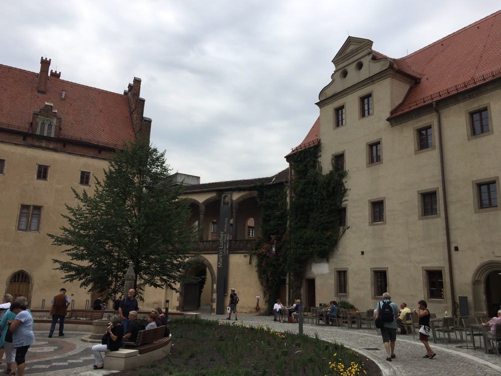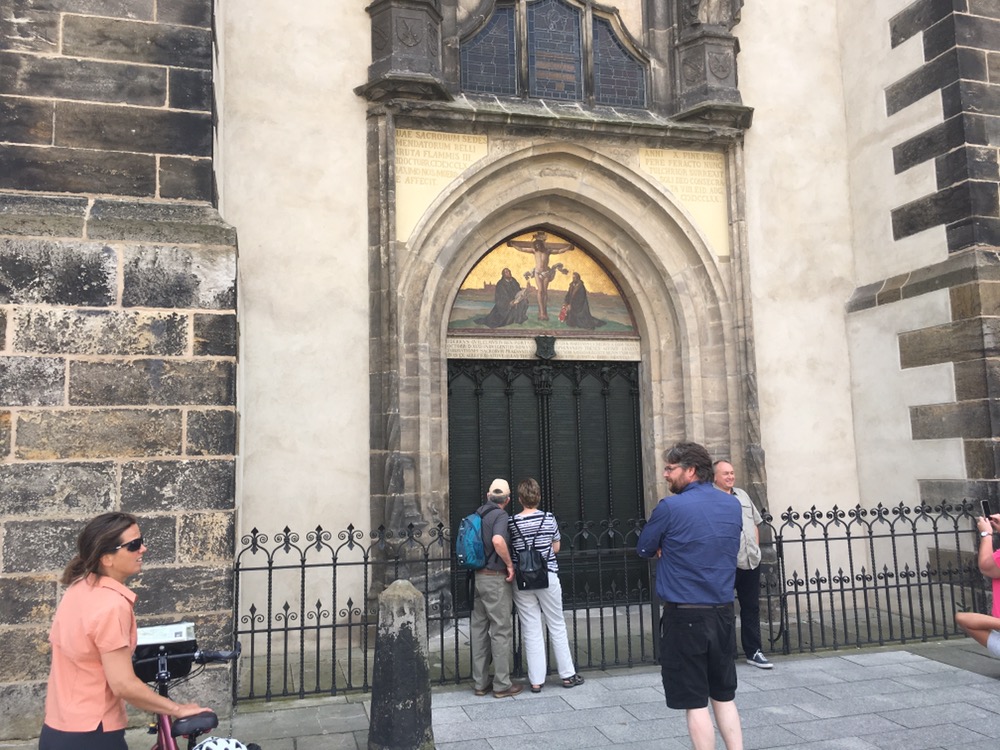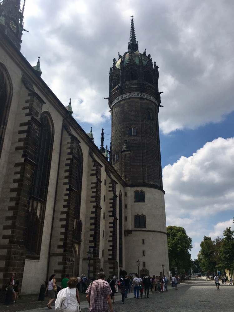 Eerste (figuurlijke) hoogtepunt vandaag was de Lutherstad Wittenberg. Luther studeerde hier en begon hier de reformatie van de katholieke kerk welke uiteindelijk uitmondde in het ontstaan van de protestantste kerk ipv de door Luther zo gehoopte hervorming van de katholieke kerk. Wittenberg bleek een erg fraaie stad met mooie en voorname huizen. Dit jaar wordt 500 jaar reformatie gevierd en daar was heel Wittenberg door ‘overgenomen’. We hebben even rondgereden en vervolgens het Lutherhaus bezocht, het voormalig woonhuis van Luther, waar we vanalles over zijn leven en de reformatie te weten kwamen. Erg interessant en blij dat we hier tijd voor vrij maakten. Na de lunch in het café in het Lutherhaus zijn we nog langs de Schlosskirche gereden waar Luther zijn beroemde 95 stellingen, o.a. tegen de praktijk van de aflaten, aan de deur spijkerde. De kerk heeft overigens een heel imposante toren.