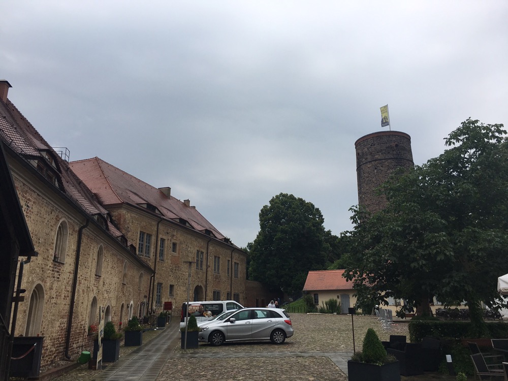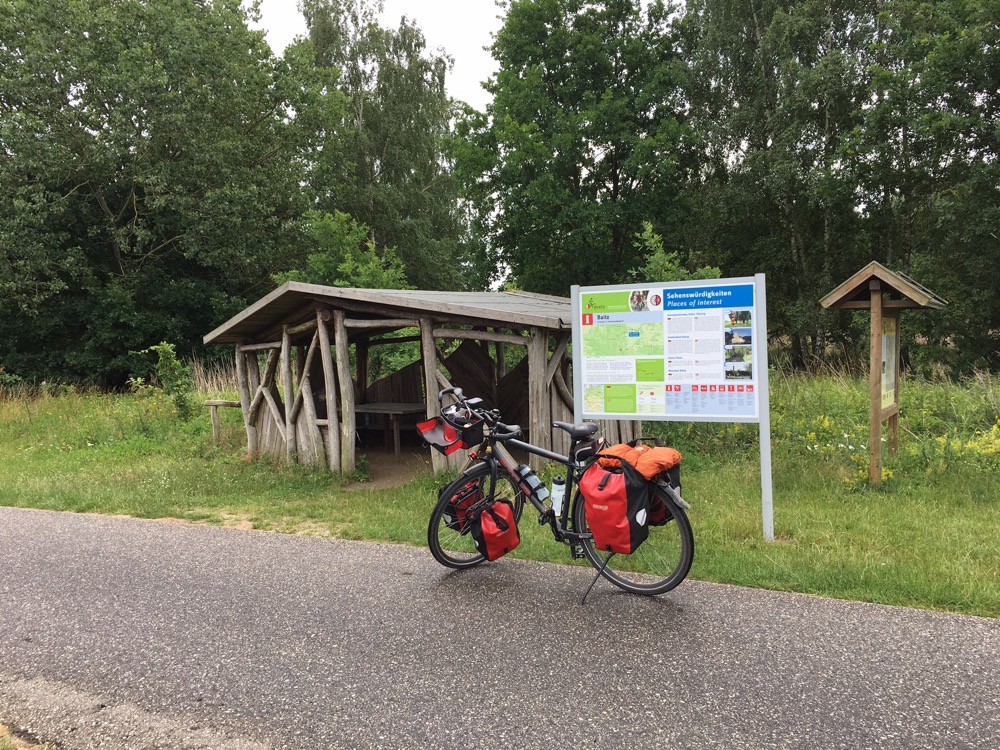 Toen we vanochtend opstonden was het grijs weer en het miezerde een beetje. Voor het ontbijt, wat niet in ons pension geserveerd werd, reden we naar een Bäckerei voor belegde broodjes met met koffie. Inclusief een leuk gesprek met twee Duitse fietsers die vanaf Görlitz waren komen fietsen en Görlitz van harte bij ons aanbevolen. Na het ontbijt hebben we Bad Belzig nog een beetje beter bekeken en dan met name Burg Eisenhardt. Het eerste stuk route na Bad Belzig was weer erg mooi. Door fraai en afwisselend natuurgebied ging het verder. En wel grotendeels over heel erg goed asfalt op vrijliggende fietspaden. En langs vele overdekte picknick plaatsjes die eigenlijk overal langs de R1 te vinden zijn, maar hier echt in overvloed (op een paar kilometer telden we er 6 of zo). Ondertussen was het weer verbeterd waardoor we ze niet nodig hadden. Vanaf de middag scheen zelfs de zon weer zo ongeveer continu. Het middenstuk vandaag ging door ietwat saaie bossen. Maar het was goed doorfietsen en de vele andere fietsers, mer of zonder uitgebreide bepakking, brachten toch wat afwisseling zodat de kilometers voorbij vlogen. Op dit stuk was er een beetje gebrek aan lunchgelegenheden zodat we uiteindelijk geluncht hebben in het, voor iedereen toegankelijke, cafetaria van een Parkinson-kliniek. Tja. Beggars can’t be choosers!