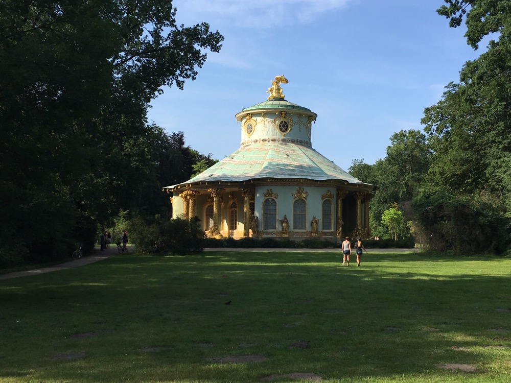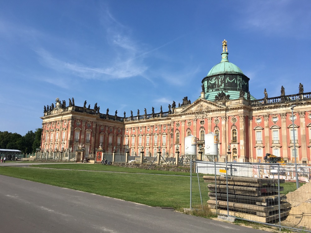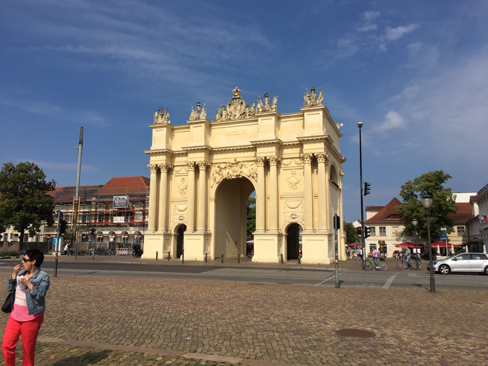 We hebben ervoor gekozen om niet meteen naar Berlijn te rijden. We zouden dan een lange etappe moeten afwerken en geen tijd hebben om nog iets van Potsdam te zien. En volgens het boekje is Potsdam de moeite waard. Dus een kortere etappe met Potsdam als doel en dan morgen door naar Berlijn, nog eens zo’n 30 a 35km. En of Potsdam de moeite waard bleek! Wat een mooie stad. Heel veel mooie gebouwen, zijn eigen Brandenburger Tor en een fantastische groot park met allerlei paleizen en andere fraaie gebouwen, Park Sanssouci.