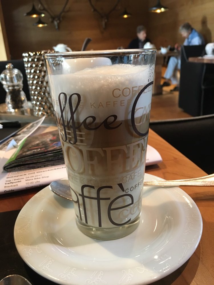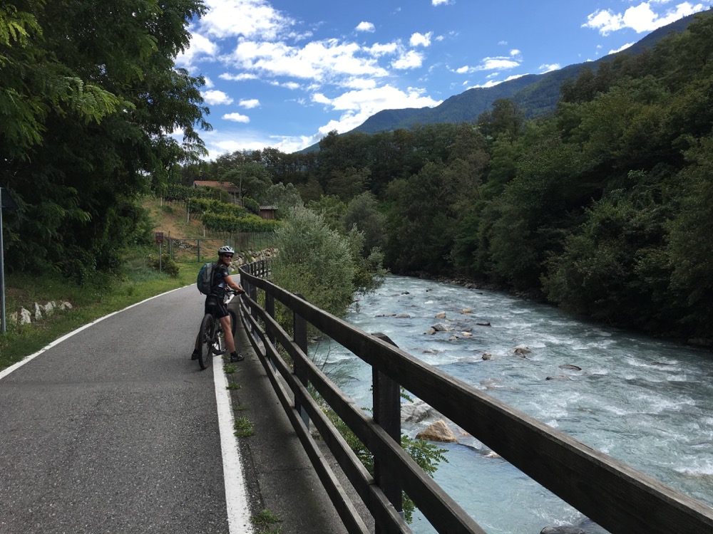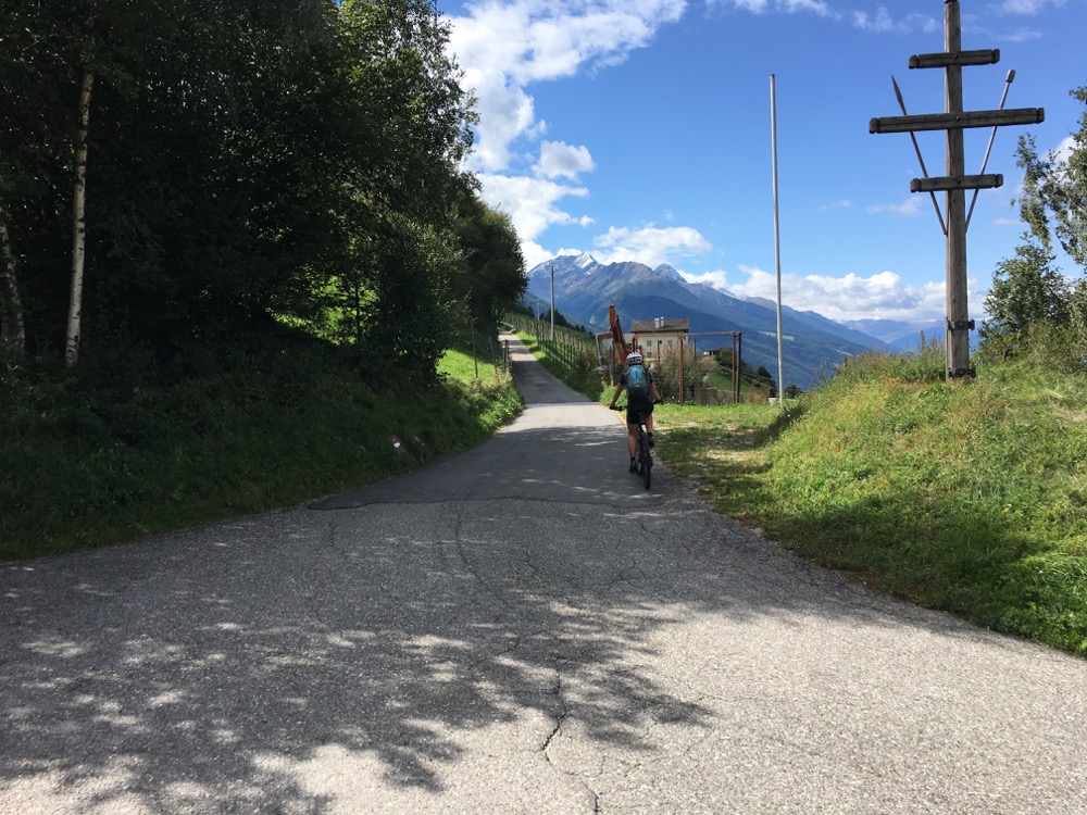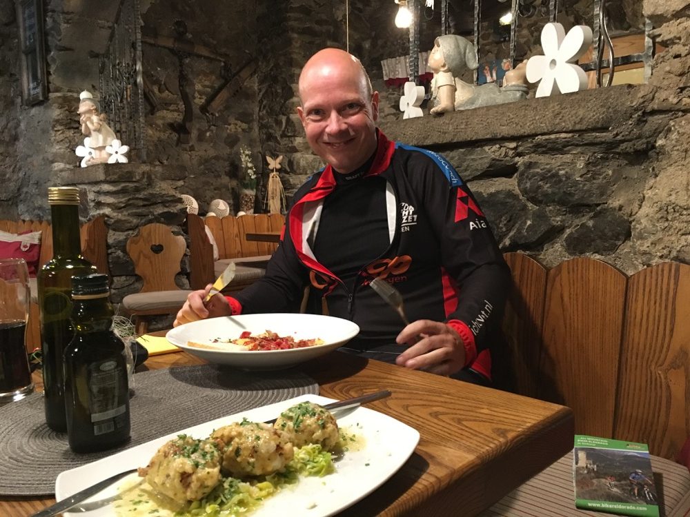 Vanochtend hebben we alle tijd genomen bij het opstaan en ontbijt. Zodoende vertrokken we ook pas tegen 11:30. We hadden zelf een route bedacht die ons al aardig wat hoogtemeters zou bezorgen, maar dan nog wel over asfalt, en op de weg terug vooral trails. Ons vermoeden dat die trails niet al te lastig zouden zijn bleek overigens onjuist. Na ons vertrek reden we eerst dalend gedurende 4,8km over het fietspad langs de Etsch naar Castelbello. Daar begon eigenlijk meteen de klim richting Marzoner Alm. Een klim van 5km waarin 600 hoogtemeters moesten worden overwonnen. De laatste kilometers van de klim kwamen niet meer onder de 12% met verschillende stukken van 17%. Pfff. Maar eigenlijk ging dat heel lekker en zonder problemen. Na de klim draaiden we af over een “schotterweg” naar Tarsch. Een lekkere afdaling over ruige schotter (steenslag) volgde. Op een gegeven moment zagen we nog twee mountainbikers die een karretje achter de bike hadden waarin een klein kind (niet veel ouder dan zuigeling) zat. Bijzonder en zij liever dan wij!