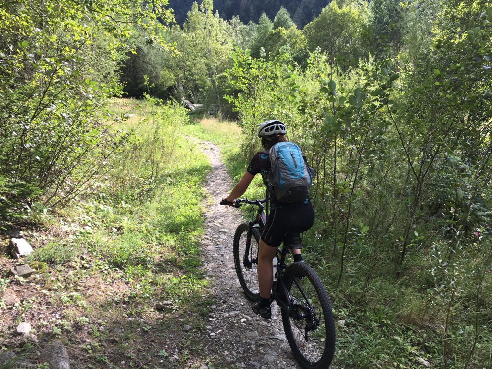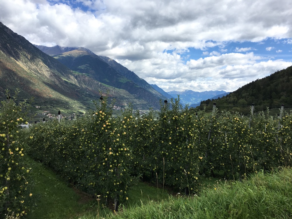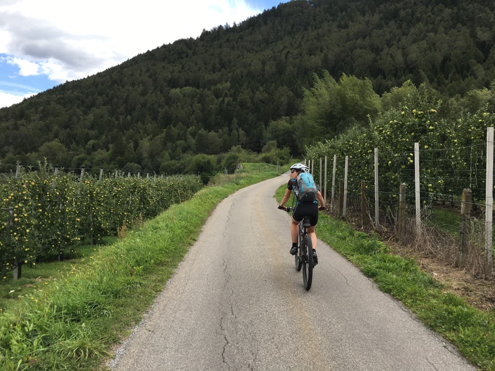 Uiteindelijk kwamen we toch, na dus al veel energie verspild te hebben, op de door ons gewenste trail, van de Latscher Trailzauber, uit. Een S1 trail, maar er zaten verschillende lastige stukken in die niet of nauwelijks onder deden voor de eerdere S2 trail. Dus ook hier hebben we weer flink wat stukken gelopen. Wel ging het steeds wat beter. Uiteindelijk toch weer hele gave stukken gereden. De naam Trailzauber wordt wel eer aan gedaan. Overigens was deze trail niet alleen downhill gericht maar zaten er ook nog stevige uphill segmenten in. Op enig moment was onze energie en concentratie wel op en zijn we via een verhard weggetje door de appelboomgaarden linea recta naar het hotel gereden.Het hele dal is hier trouwens bedekt door appelboomgaarden en de appelbomen staan in bloei. Mooi!