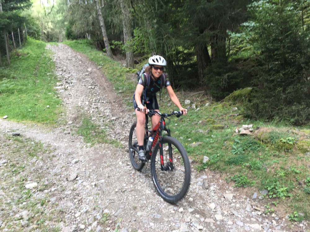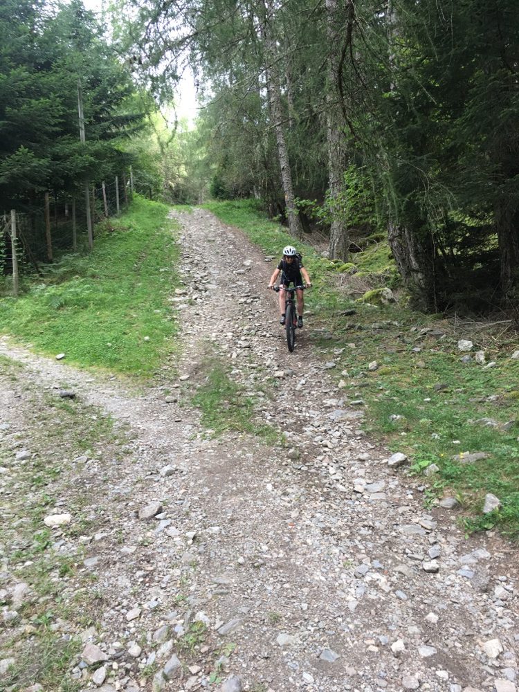 In Tarsch hebben we lekker gegeten bij een Jausestation. Meteen naar de lunch was het opnieuw klimmen geblazen, nu naar het dalstation van de Tarscher Alm stoeltjeslift. Ook deze klim was weer over asfalt en aardig steil, rond de 10%. Die paar procenten minder voelden al relaxed aan! Na het dalstation klommen we nog een stukje verder over Schotter voordat we een eerste trail terug naar beneden op draaiden. Dit was een S0 trail, niet al te lastig dus, maar soms wel heel steil. Genieten! Beneden in Tarsch hebben we ons via trails een weg gezocht naar de zogenaamde Latscher Trailzauber route. Die tussenliggende trails waren niet mals, flinke stukken S2 maakte het dat stukken voor ons niet goed te rijden waren. Enerzijds omdat het gewoon erg lastige stukken waren en anderzijds omdat we, zo aan het begin van onze vakantie, nog nergens aan gewend zijn. We hebben dan wel vorig weekend nog even stevig in Zuid Limburg gereden waar ook een aantal pittige downhill trails op onze route lagen, maar Zuid Limburg is geen Süd Tirol!