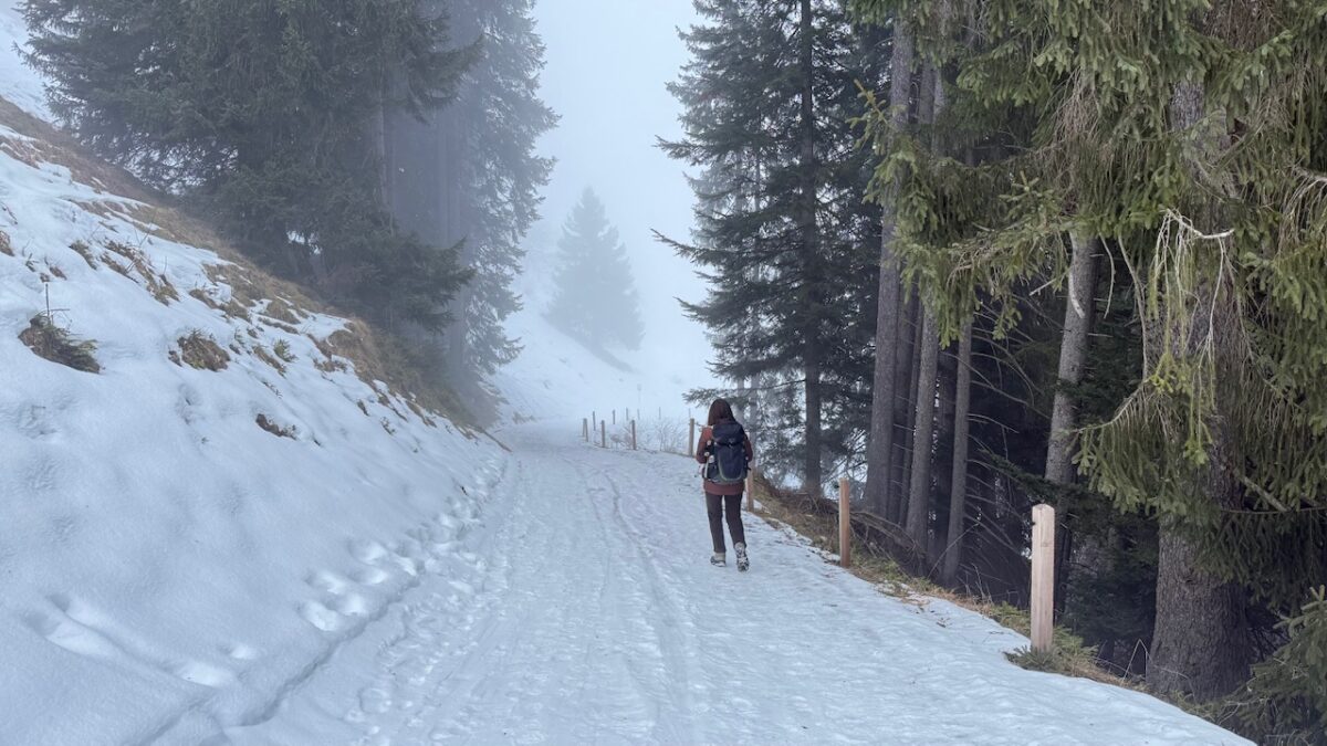 Na een lekkere lunch waar we kort gekletst hebben met een Nederlands stel dat hetzelfde deed als wij (winterwandelen afwisselen met skiën) hadden we de keuze: terug via dezelfde route of via een iets langere maar eenvoudigere route. We kozen voor het laatste. Een deel van die route was tegenovergesteld aan een stuk wat we zaterdag liepen. Nu echter met veel meer sneeuw op en naast het pad en, vanwege de andere richting, met weer heel andere gezichtspunten. Bijzonder fraai. Langzamerhand werd het steeds mistiger , ook al probeerde de zon er nog doorheen te piepen. Die mist bracht ons weer sprookjesachtige beelden.